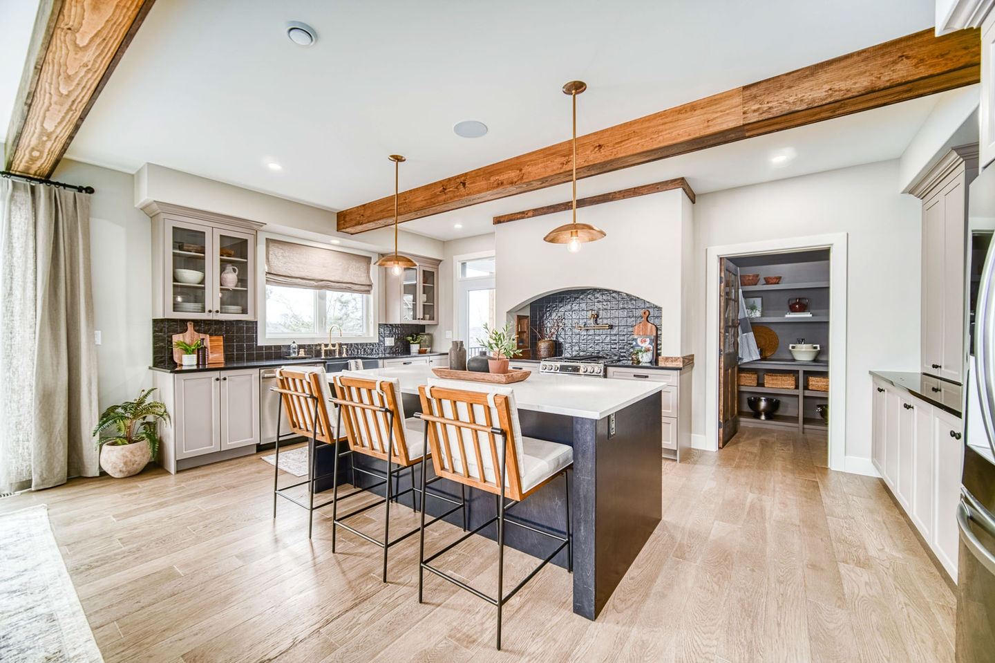 The main floor features an open-concept layout filled with natural light, a warm propane fireplace, and a gourmet kitchen designed for both everyday living and entertaining.